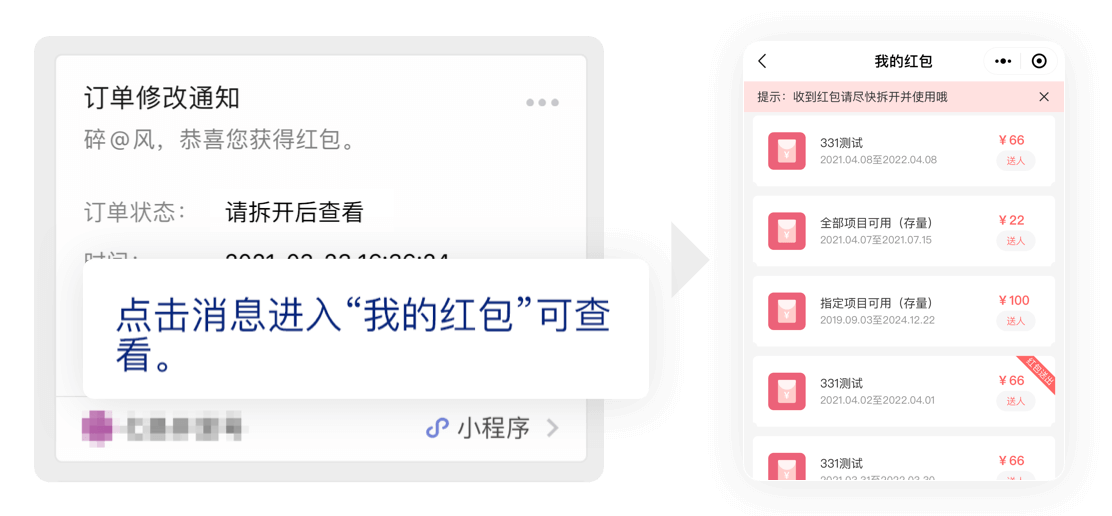 发送红包后,红包将直接放入顾客的小程序或公众号会员帐户中,同时也会收到获得红包的微信推送消息哦~