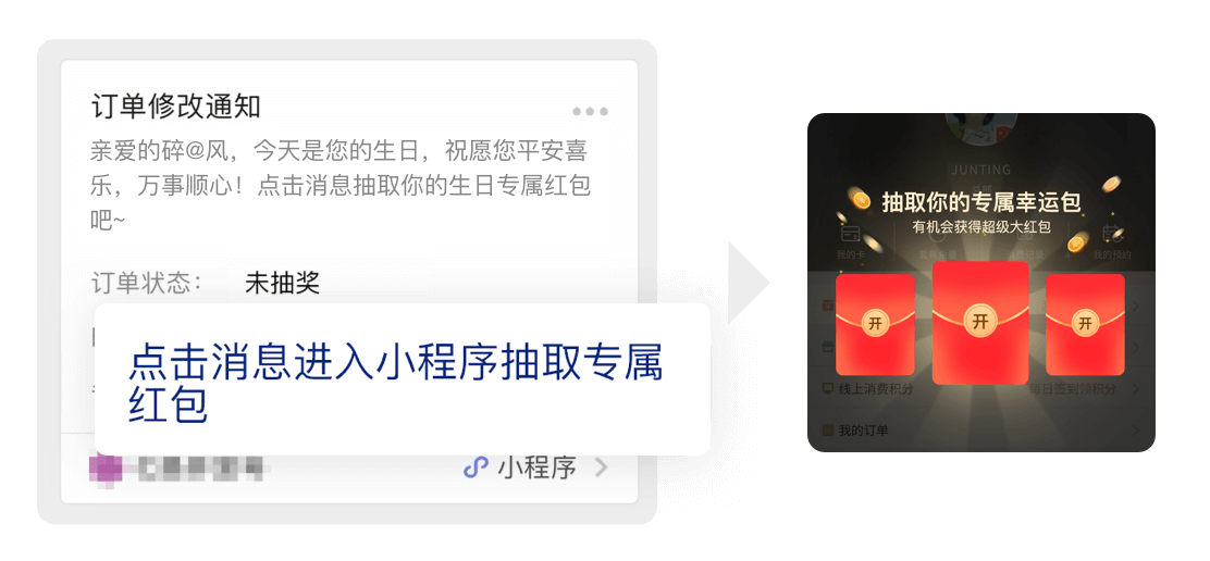 发送红包后,顾客将收到门店微信推送通知,顾客点击通知,可打开小程序或公众号进 行抽取